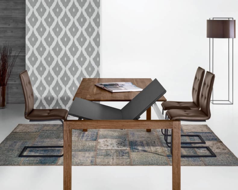 Die Basis des Tisches Art ist das Element, das ihn in höherem Mass auszeichnet: Er besteht aus einem Trapez aus Metall, das sich diagonal zur Platte erstreckt, wobei es den Platzbedarf zugunsten eines grösseren nutzbaren Platzes optimiert. Alles in allem zeichnet sich die so entwickelte Trägerstruktur durch den erhöhten Dynamismus, die Solidität und die plastische Wirkung aus. Die Platte liegt fest auf, aber der Schlusseffekt ist eine grosse Leichtigkeit.