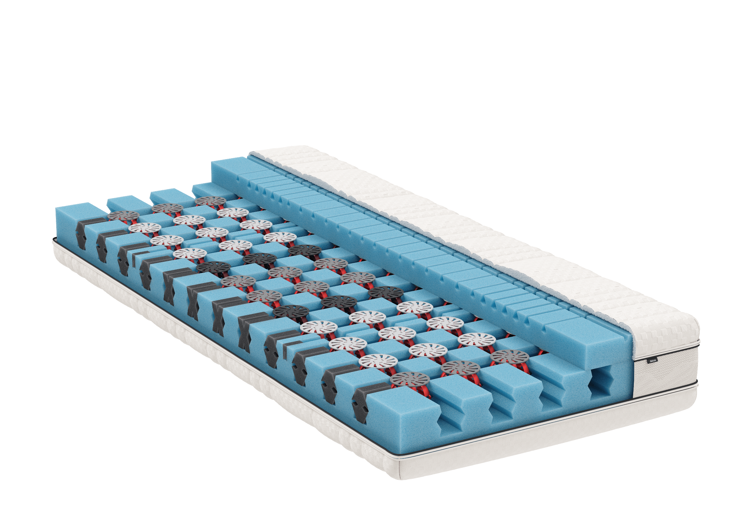 Noyau avec éléments à ressorts Triple Body Support (TBS) sur toutes les zones du corps. Le système de ventilation tridimensionnelle associé à la mousse confortable BluePore durable assure un climat de lit parfait et un positionnement équilibré du corps.