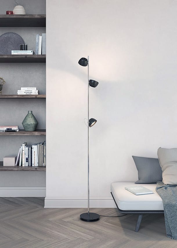 Die Stehleuchte IRIO bietet ein Maximum an Lichtmenge und variabilität bei einer minimalistischen und schlichten Formsprache. Die drei Leuchtenköpfe können durch die Magnetkontakte werkzeuglos entlang der Stange frei positioniert, gedreht oder in ihrer Achse geneigt werden. Je nach Raum und Anwendung lassen sich verschiedene Lichtsituationen spielerisch inszenieren.