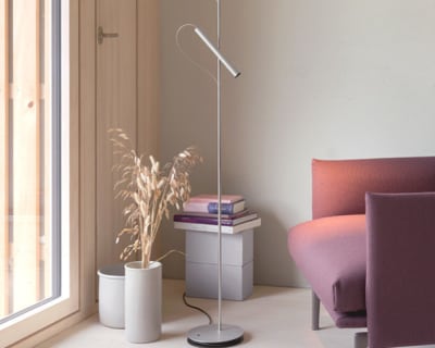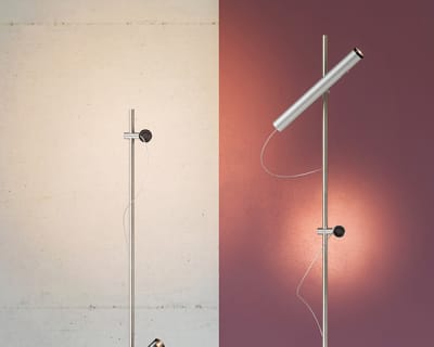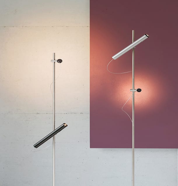 Die zwei Leuchtenköpfe können einzeln geschaltet und gedimmt werden. Sie lassen sich entlang des Gestänges verschieben und frei richten. Ob Kunstwerk oder Bücherwand – Objekte werden gezielt in Szene gesetzt, da die Stehleuchte über einen variablen Ausstrahlwinkel verfügt. Gleichzeitig erzeugt sie ein optimales, blendfreies Leselicht. Dazu wird der untere Kopf fokussiert gerichtet, während der obere Leuchtenkopf den Raum mit seinem sanften indirekten Licht bespielt.
