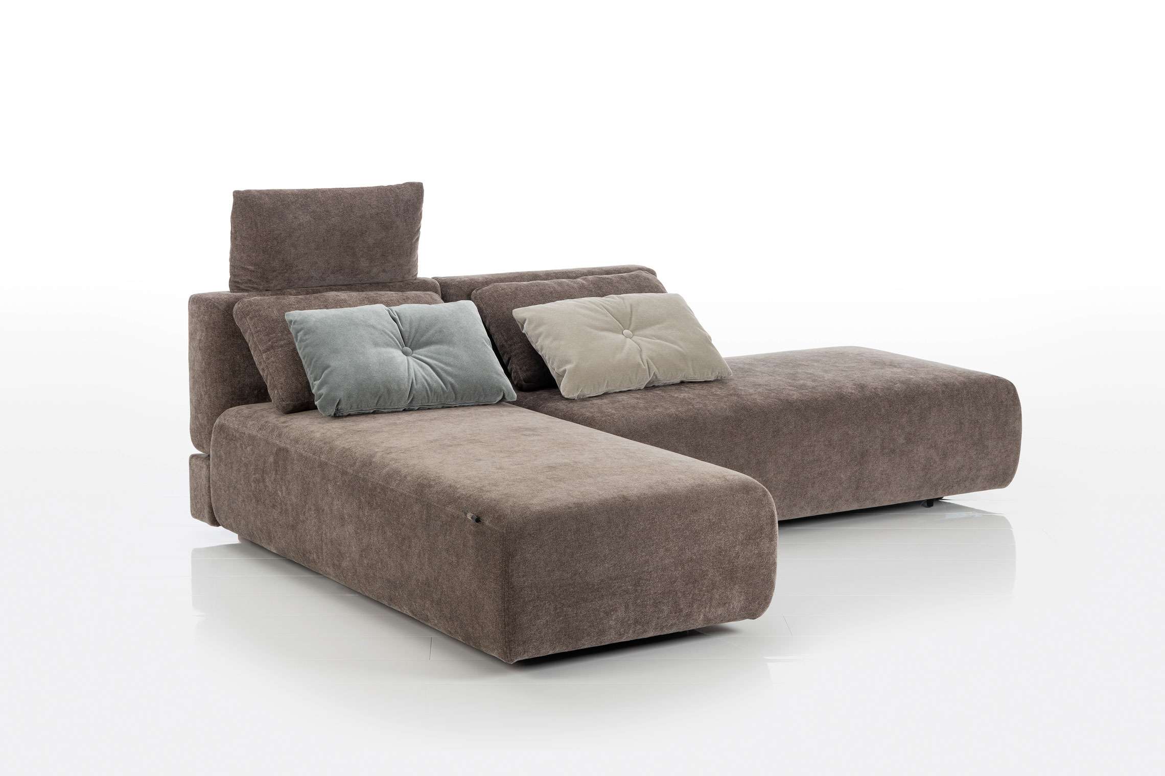 Von der Grundposition als Ecksofa wandelt sich piano small mit größter Leichtkeit in eine Polsterfläche zum Loungen oder Schlafen, wobei die Loungefläche 160 x 160 cm misst und die Liegefläche 160 x 205 cm. Zum Schlafen werden ganz einfach die Rückenlehnen abgesenkt.