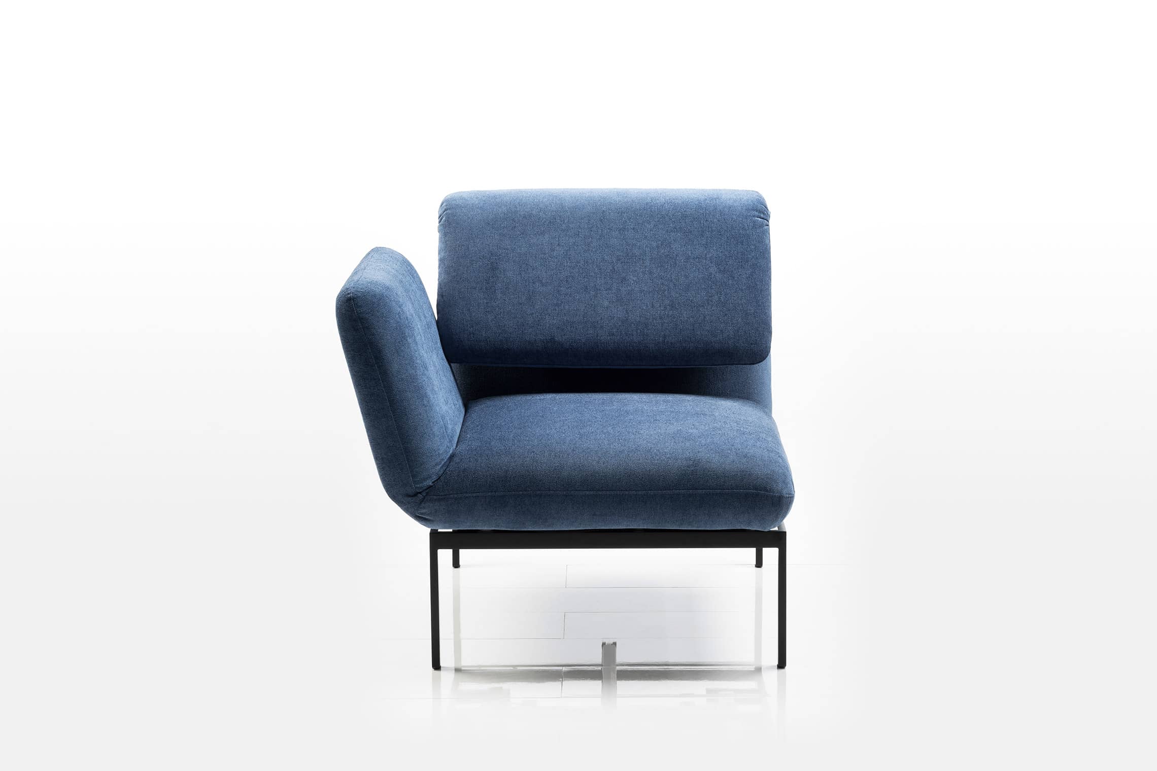 Basis des Sessels ist ein um 90 Grad drehbarer Sitz, der sich in Lounge- oder Liegeposition vorschwenken lässt, sowie eine stufenlos verstellbare Rückenlehne.