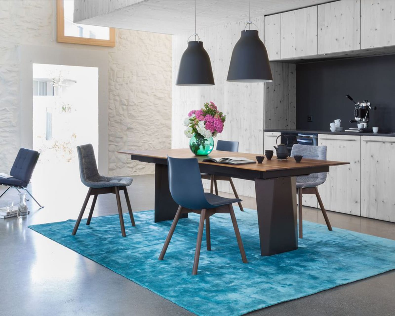Ganz ohne Kraftaufwand lässt sich die Tischfläche um 70 oder 100 cm verlängern. Dank der synchron geführten Auszugstechnik erweitert sich die Tischplatte auf beiden Seiten, während das Untergestell an Ort und Stelle stehen bleibe. Die 28 mm starke Tischplatte und die Verlängerungsplatte werden aus einem Blatt hergestellt, sodass die Holzmaserung durchgehend verläuft. Bela ist als Baukastensystem in vielen Ausführungen verfügbar.