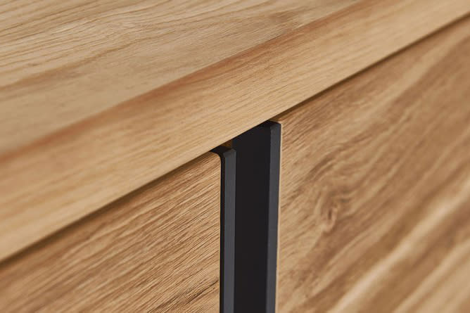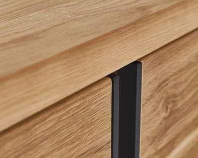 In der PLAN X Programmwelt ist X4 „das Zeitlose“. Ausdrucksstark gemasertes Holz und Metallleisten als raffinierte Designelemente definieren den Möbelcharakter. Die Maserung scheint im Licht zu tanzen und die vertikal dazu verlaufenden Metallleisten setzen einen modernen Akzent, der X4 in Wohnzimmern zeitlos schön wirken lässt. Dazu kommt viel Stauraum – für Design und Funktion in höchster Vollendung. Freuen Sie sich auf eine Ausführung in Eiche rustico hell geölt, eine Metallleiste in anthrazit sowie LED-Licht und sanft schliessende Schubkästen mit Selbsteinzug.